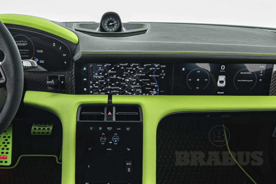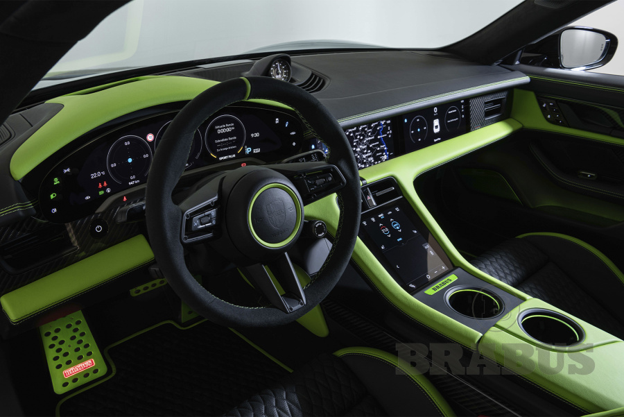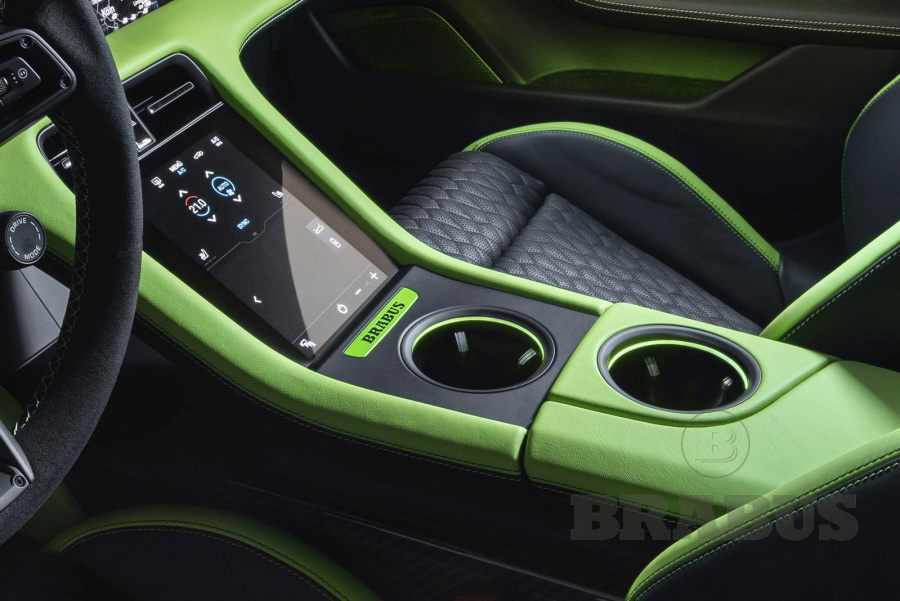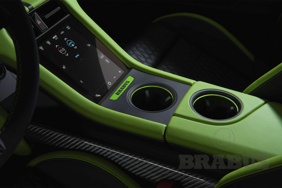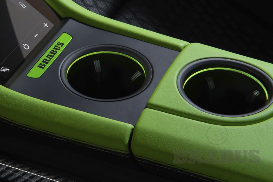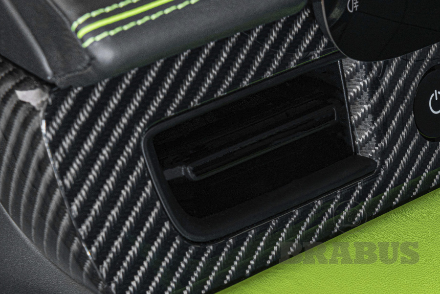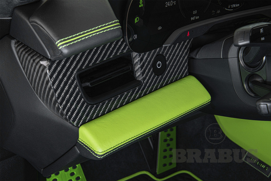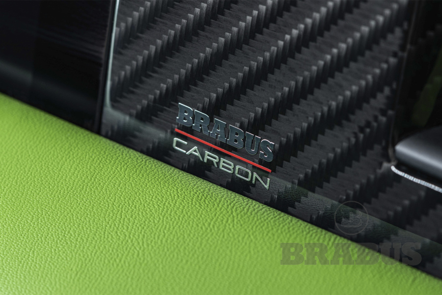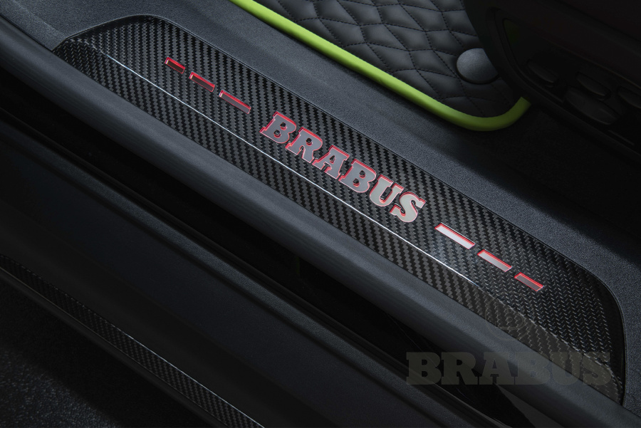 Накладки, изготовленные из высококачественного углеродного волокна (из четырех частей), отличаются четкой структурой и элегантностью. Логотип BRABUS со светодиодной подсветкой светится, меняя цвет с белого на красный.